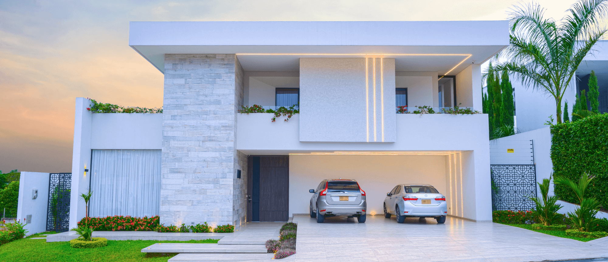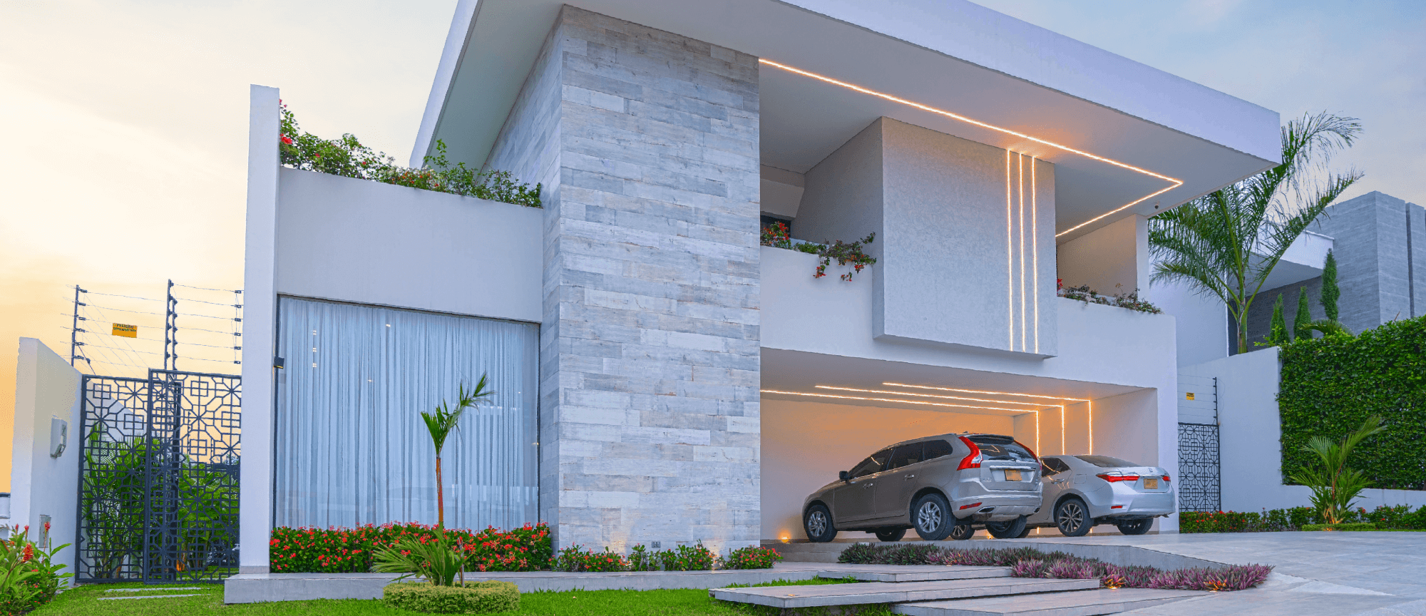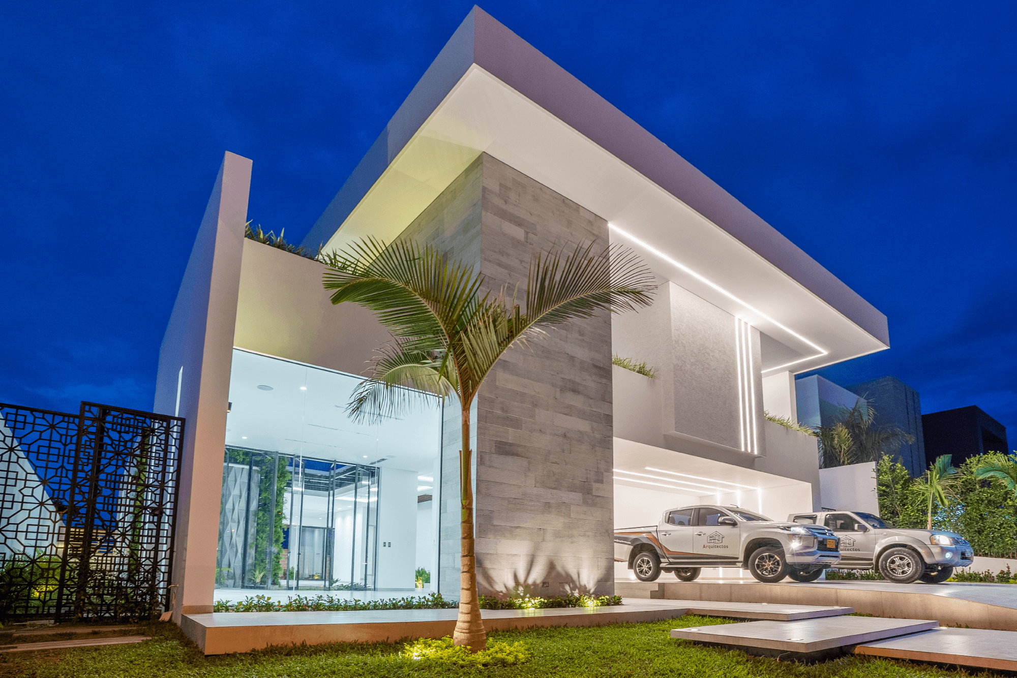 Este proyecto residencial de líneas limpias y geometría definida representa un equilibrio perfecto entre sofisticación, funcionalidad y estética contemporánea. La fachada principal combina texturas sutiles, colores claros, creando una composición armónica que resalta con iluminación arquitectónica cuidadosamente integrada; las jardineras lineales aportan un toque natural que suaviza la estructura. Mientras el diseño prioriza la simetría, el orden visual y la conexión con el paisaje, ofreciendo una experiencia residencial de alta categoría.