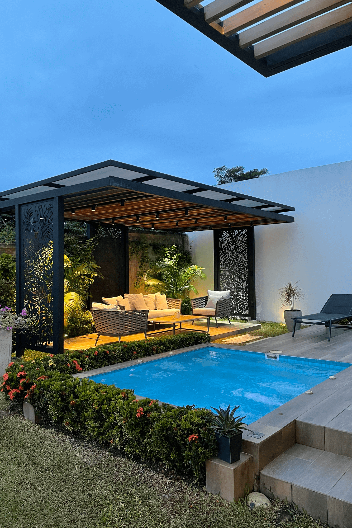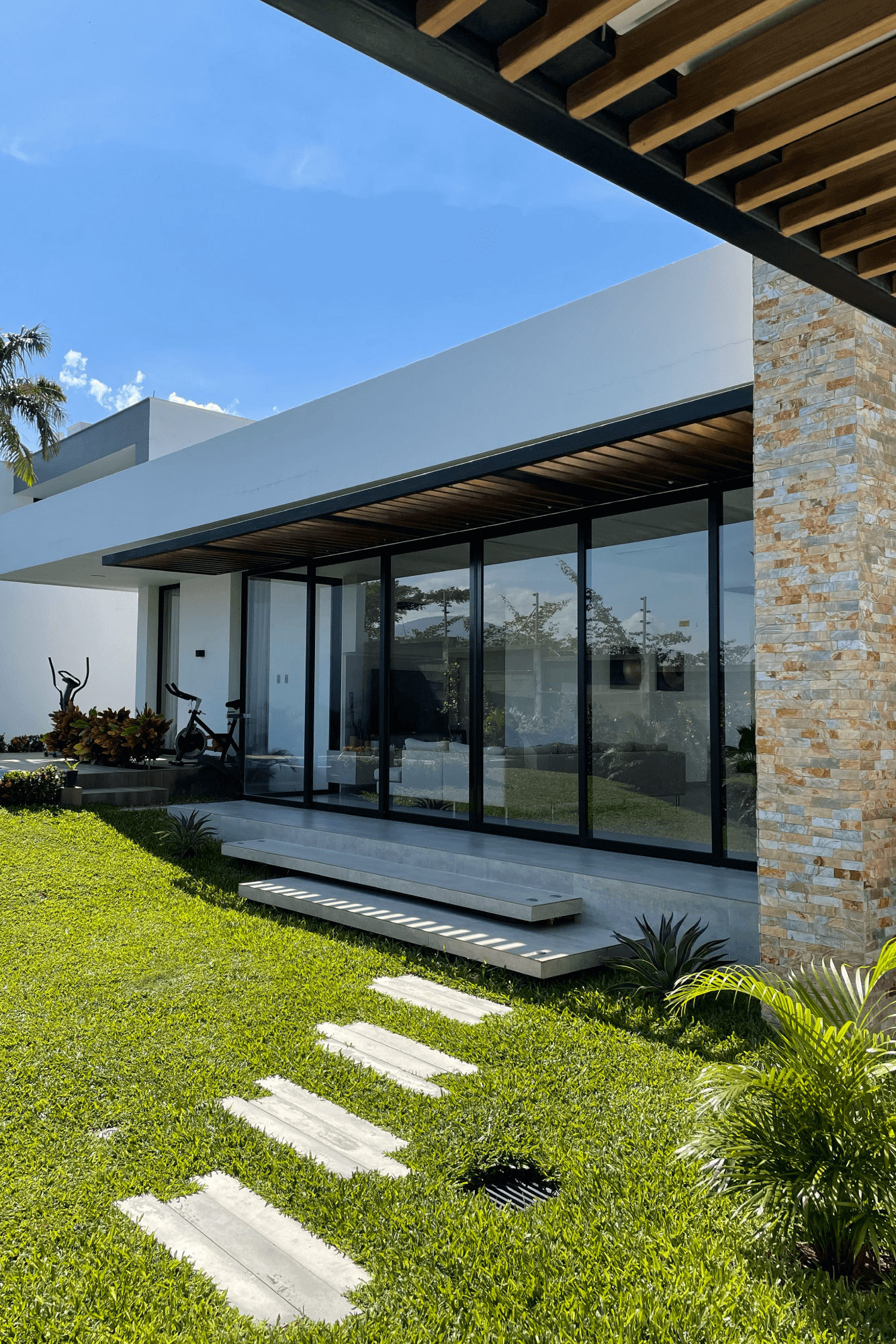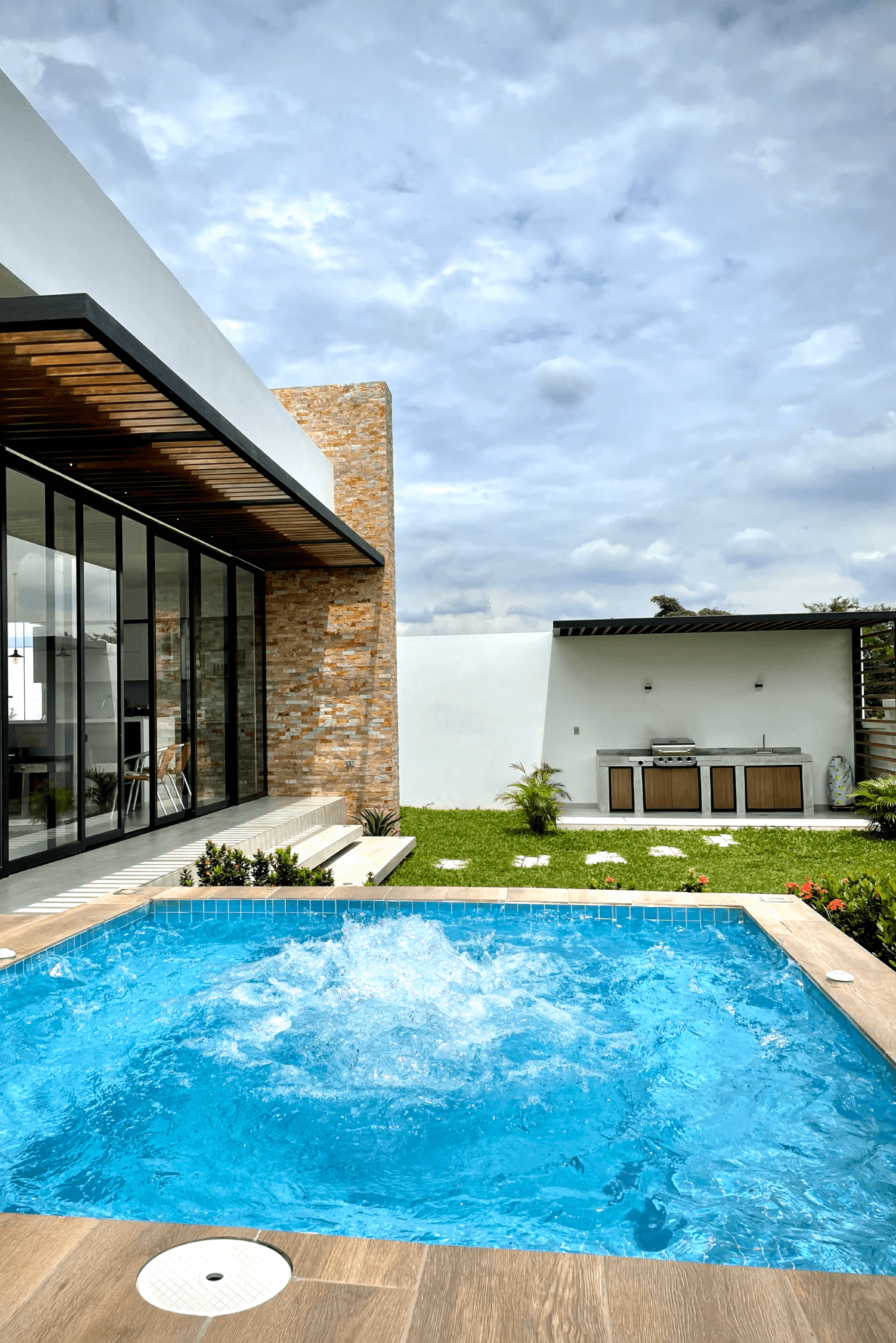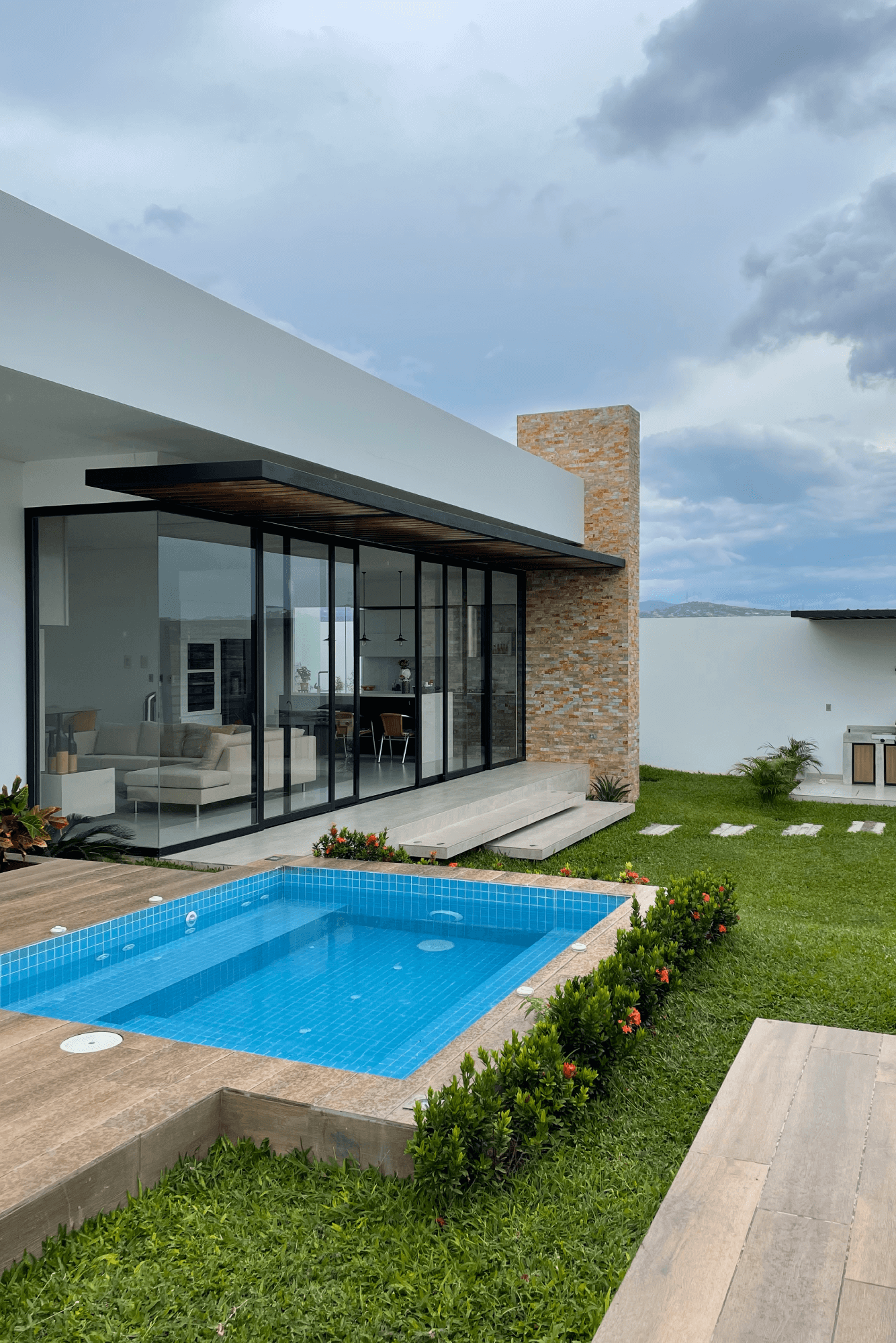 Este proyecto residencial de líneas limpias y geometría definida representa un equilibrio perfecto entre sofisticación, funcionalidad y estética contemporánea. La fachada principal combina texturas sutiles, colores claros, creando una composición armónica que resalta con iluminación arquitectónica cuidadosamente integrada; las jardineras lineales aportan un toque natural que suaviza la estructura. Mientras el diseño prioriza la simetría, el orden visual y la conexión con el paisaje, ofreciendo una experiencia residencial de alta categoría.